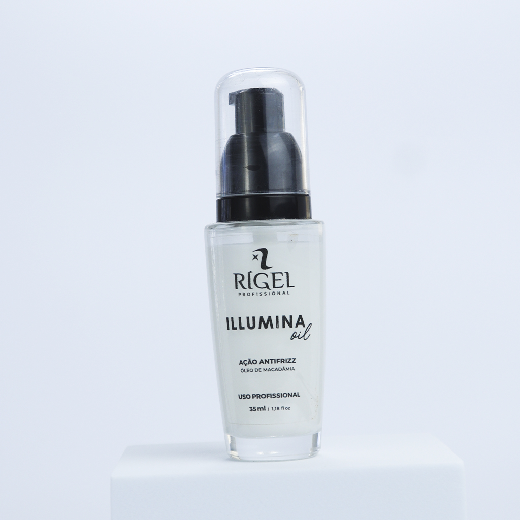O óleo reparador – Illumina Oil da Rígel Profissional tem fórmula especial, é enriquecida com óleo da macadâmia e possui ação antifrizz.