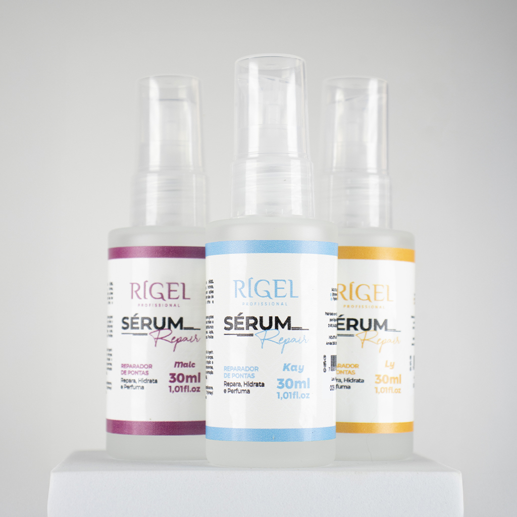 O Sérum Repair da Rígel Profissional repara, hidrata, perfuma e protege contra ações externas e do calor.